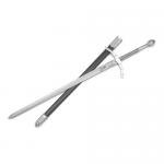 This Spanish design is a classic example of personal edged weaponry of the 14th Century. Bold and sturdy, it was designed for brutal close quarters combat, and found its place in history via the Crusades. This elegant and powerful sword features a polished metal handle, curved hand-guard and 35" zinc blade. The black scabbard of this replica sword is leatherette wrapped with metal furniture.